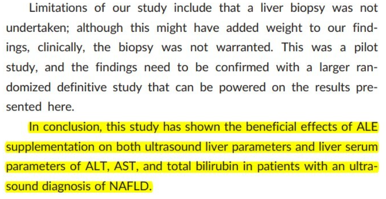 “결과적으로 이 연구는 ALE(아티초크 잎 추출물)의 보충이 초음파로 NAFLD(비알코올성 지방간 질환)을 진단받은 환자들에게 초음파 간 파라미터와 간 혈청 파라미터(ALT, AST, 총 빌리루빈) 모두에 유익한 영향을 미친다는 것을 보여준다.”