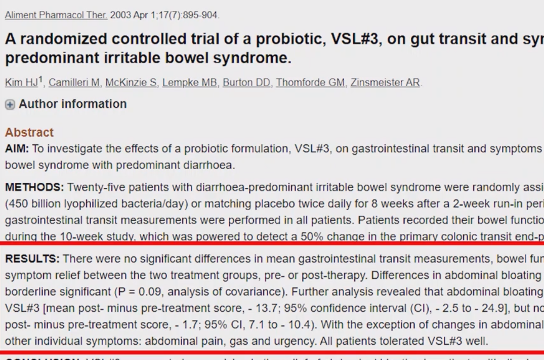 먼저, 설사 우세형 과민성대장증후군을 가진 환자 25명이 VSL#3를 4주간 복용한 결과, 복부팽만감과 가스가 차는 증상 등이 개선이 되었다는 연구 논문입니다.