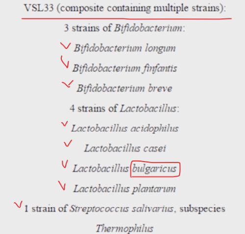 VSL#3는 앞서 보신 것 처럼 8가지 균종을 다 포함하고 있습니다. 균종들이 고함량으로 잘 혼합된 유산균 형태입니다. 우리가 불가리스로 잘 아는 유산균도 포함되어 있습니다.