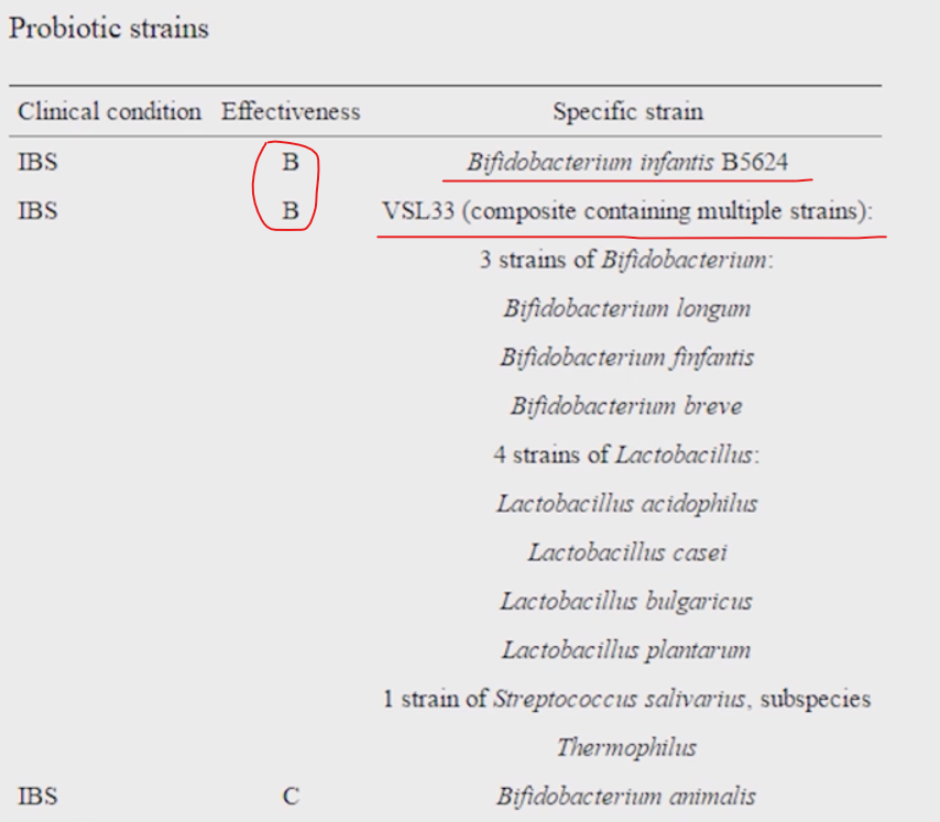 두 가지 균종은 Bifidobacterium infantis B5624와 VSL#3(VSL33)입니다. 그래서 현존하는 프로바이오틱스 중에서 과민성대장증후군에 가장효과적인 프로바이오틱스는 B등급을 받은 Bifidobacterium infantis B5624와 VSL#3입니다.
