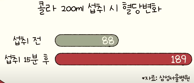 삼성서울병원에서 공개한 콜라 200ml 섭취 시 혈당변화는 섭취 후 15분이 지나면 혈당이 189까지 올라가는 것으로 보고되었습니다. 혈당이 높아지면 체내에 과다한 에너지를 축적하게 만듭니다. 과다한 에너지는 지방으로 변환되어 체지방의 축적을 촉진하기 때문에 혈당이 높은 것은 다이어트에서 가장 위험합니다.