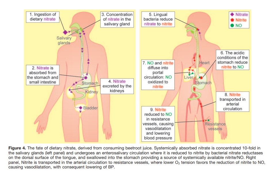 아래 그림은 논문에 나타난 비트 뿌리 주스 섭취로 인해 질산염이 어떻게 아질산염으로 바뀌는지 설명한 그림입니다. 전신적으로 흡수된 질산염은 왼쪽 그림처럼 침샘에서 10배 농축되고 혀 표면의 박테리아에 의해 아질산염으로 변환되기 위해서 장-타액 순환을 거쳐 위장으로 삼켜져 전신적으로 이용 가능한 아질산염(Nitrite-주황색) / 일산화질소(NO)의 원천이 됩니다. 오른쪽 그림에서 아질산염은 동맥 순환을 통해 작은 혈관들로 운반되는데, 이때 아질산염이 일산화질소로 전환되어 혈관 확장을 일으키고 결과적으로 혈압을 낮춥니다.