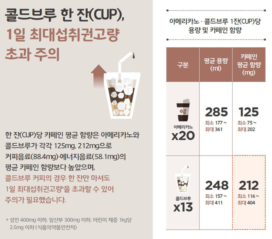 특히 콜드브루의 경우 1잔만 마셔도 식약처의 일일 카페인 섭취 최대 허용량인 400mg을 넘을 수 있는 것으로 조사되어 주의가 필요합니다.